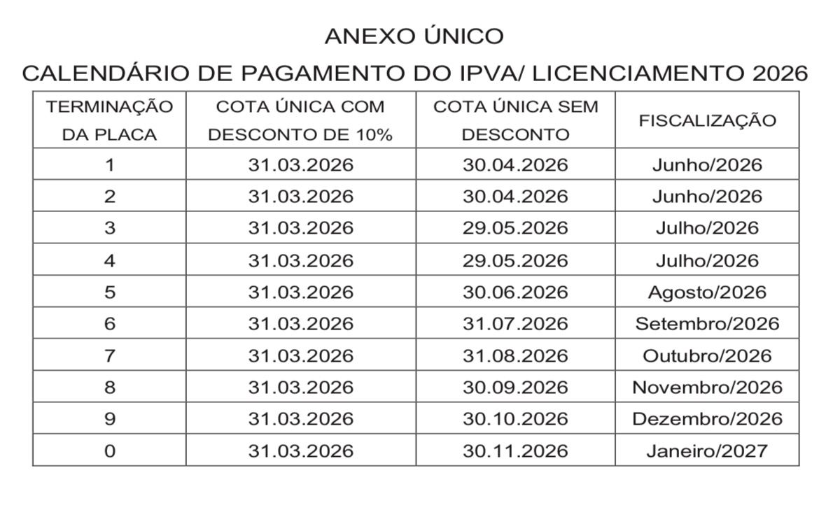O calendário segue ao longo do ano e se encerra em novembro, mês em que vence o pagamento para veículos com placa terminada em 0. O IPVA também pode ser parcelado em até dez vezes no cartão de crédito, com incidência de encargos definidos pelas operadoras.
